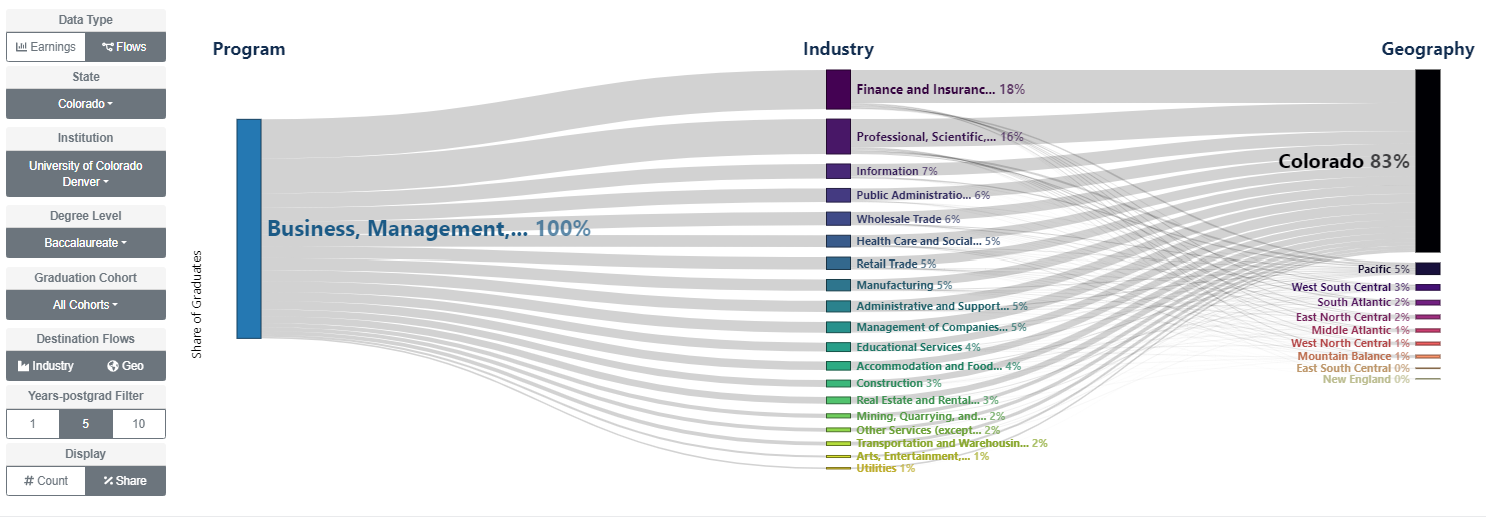 This example selection is from CU Denver’s Baccalaureate program related to the CIP-code family “Business, Management, Marketing, and Related Support Services.” Here we can see that, five years post-graduation, 83% of our graduates have remained in Colorado, with the largest groups working in either the Finance and Insurance industry (18%) or Professional, Scientific, and Technical Services (16%). This information can be valuable for informing decisions regarding course offerings and content, microcredential creation, interdisciplinary partnerships, and marketing decisions, to name a few. If this is an area of interest, our Market Intelligence team here at TIPS has access to additional tools that can provide more granular views into similar outcomes of your graduates.